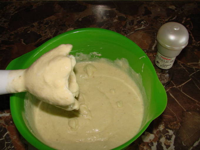- Combineer boter op kamertemperatuur, zure room, gecondenseerde melk, gehakte hazelnoten, gehakte bananen en droge ingrediënten. Klop met een blender tot een gladde massa.
