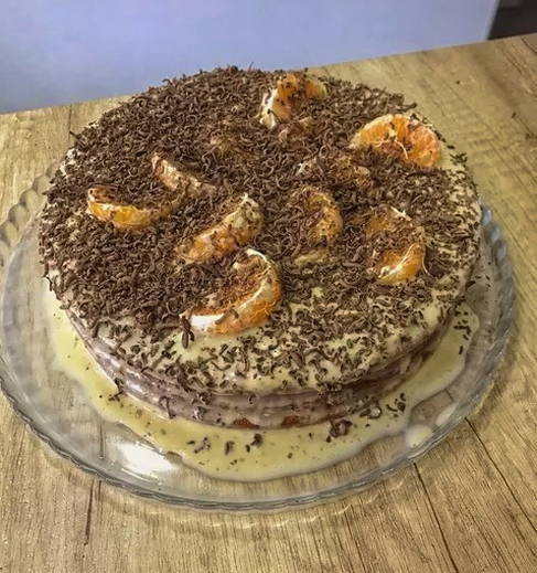 - Vet de bovenste laag van de cake in met room, versier met plakjes mandarijn en bestrooi met geraspte chocolade op een fijne rasp.