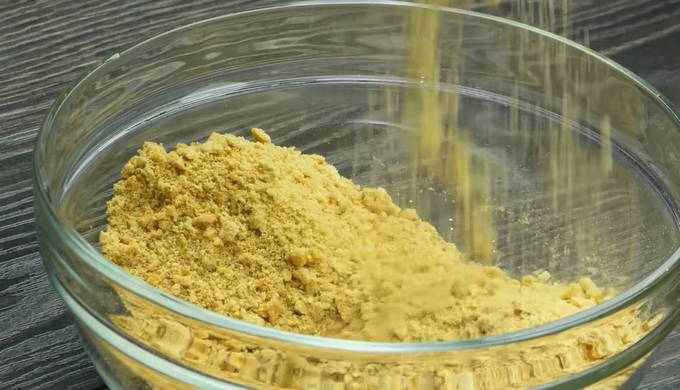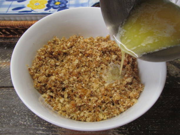 - Smelt de boter in steelpannen op laag vuur. En giet het in een bak met kruimels.
