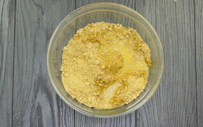 - Breng de romige massa over in een bak met gemalen koekjes en meng goed.