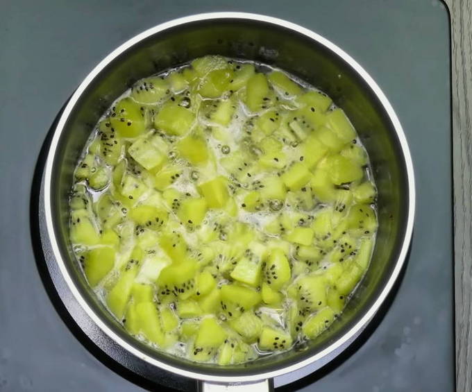 - Schil de kiwi en snijd in kleine blokjes, die we in een pan doen, op smaak brengen met suiker en citroensap. Verwarm ongeveer vier minuten op middelhoog vuur, roer met een spatel, tot het natuurlijke sap vrijkomt.