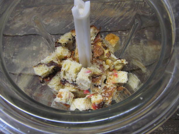 - Snijd de gebakjes in kleine blokjes en gebruik een blender om ze in kruimels te breken.