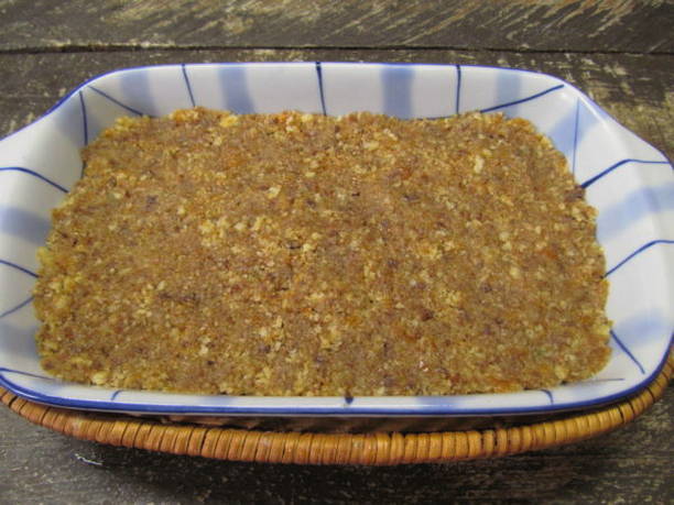 - Voor de vorming van de cake past elke vorm van uw keuze bij u. We schuiven het kruim in een voor ingevette vorm, verdelen het gelijkmatig over het hele oppervlak en stampen het aan met een lepel.