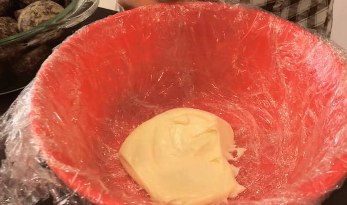 - We bedekken een diepe kom met een taps toelopende bodem volledig met huishoudfolie en doen een kleine hoeveelheid zure room op de bodem.