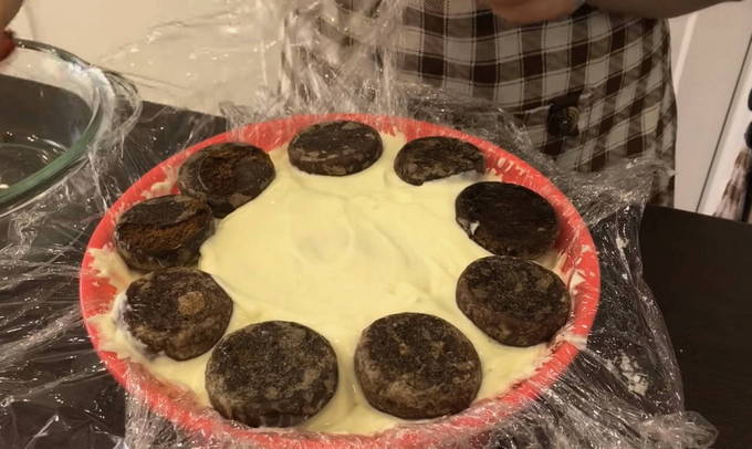 - Leg de laatste laag met de bovenkant van de peperkoek naar beneden om een plat oppervlak te krijgen. We wikkelen de cake met de randen van de huishoudfolie en laten hem een paar uur op kamertemperatuur staan, zodat de peperkoekkoekjes kunnen weken. En dan sturen we het minstens een uur naar de koelkast, zodat de zure room alle componenten bij elkaar grijpt en vasthoudt.