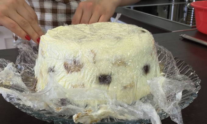 - Open de randen van de folie, bedek de kom met de cake met een grote schaal en draai de cake om. Verwijder de film voorzichtig volledig.