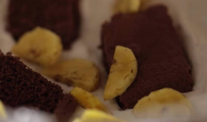 - Vet nu elke peperkoek in en leg hem stevig tegen elkaar. Voeg de bananen toe als de peperkoeklaag is aangelegd. Bananen geven een neutrale textuur. Bestrooi met schaafsel erover en bedek opnieuw met een dun laagje zure room. Weer een laagje peperkoek en bananen.