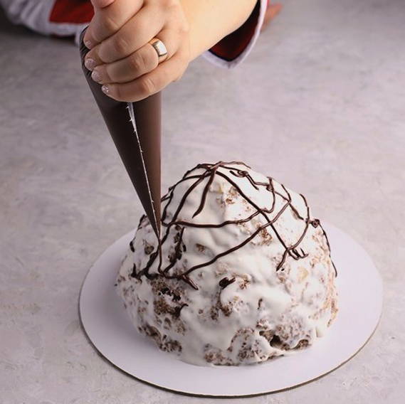 - Leg de massa op een serveerschaal in de vorm van een glijbaan, giet de resterende zure room aan alle kanten. Versier met gekoeld glazuur met behulp van een spuitzak met eventuele inscripties en patronen.