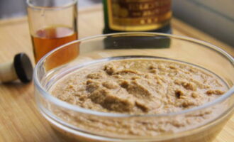 Bestrijk het vlees voorzichtig met het resulterende mengsel. We plaatsen het product op het rooster, dat we over de bakplaat plaatsen. 1,5-2 uur koken in een op 80 graden voorverwarmde oven.