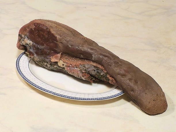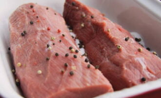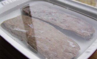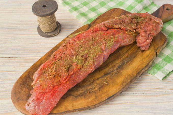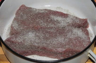- We wassen het vlees, reinigen het van de aderen en vullen het met zout. We bewaren het werkstuk 4-5 dagen in de koelkast.