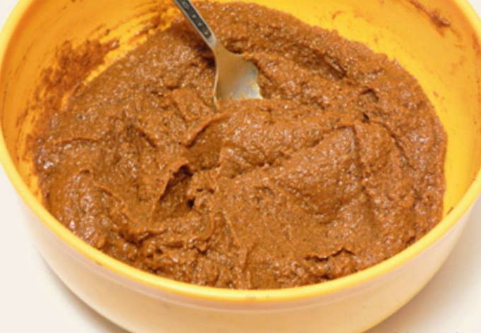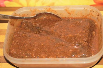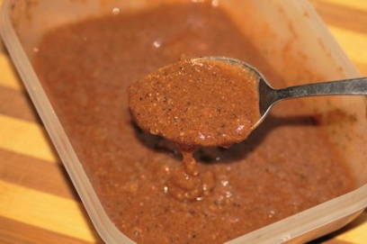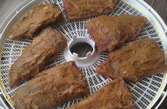- Combineer gemalen paprika, paprika, gedroogde knoflook en een beetje water. Kneed de massa en bedek het vlees ermee. We doen het product in een groentedroger en koken 5 uur op een temperatuur van 50-60 graden.