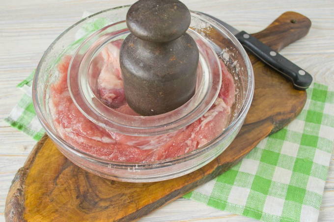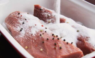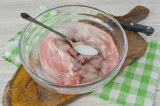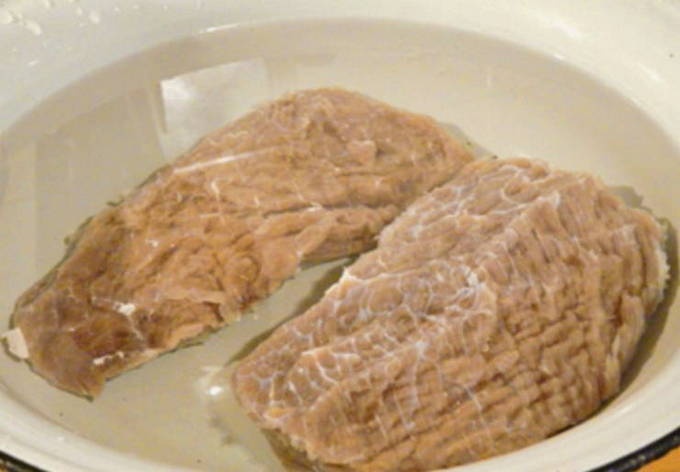- Na een tijdje moet het vlees worden afgespoeld van zout en enkele uren in koud water worden geweekt.