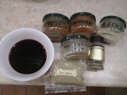 - Voeg paprika, peper, gedroogde knoflook, nootmuskaat en koriander toe aan de rode wijn.