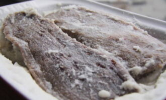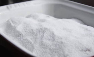 Het zout moet het vlees volledig bedekken. We sturen het werkstuk 3 dagen naar de koelkast. In de winter kun je hem op het balkon zetten.