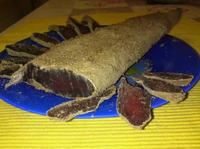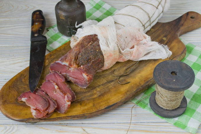 - Pittige basturma volgens Armeens recept is klaar! Snijd je traktatie en serveer!