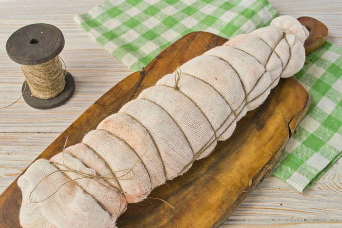 - We wikkelen het pittige vlees in kaasdoek en binden het stevig vast. We hangen 5 dagen op een koele plek.