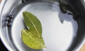 Daarna koken we water met laurierblaadjes en jeneverbessen.
