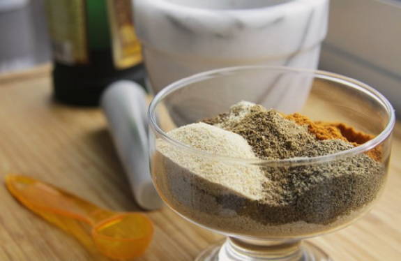 We mengen alle resterende droge kruiden in een gemeenschappelijk bord.