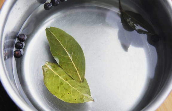 Daarna koken we water met laurierblaadjes en jeneverbessen.