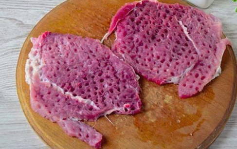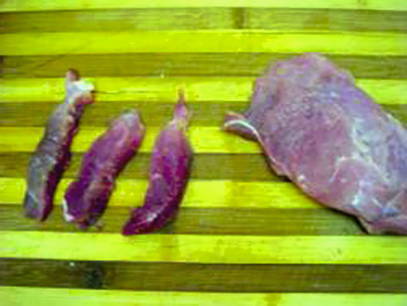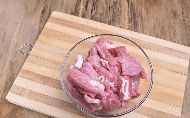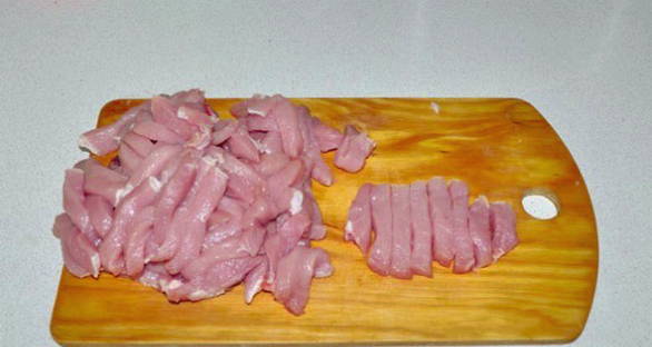 - Snijd het varkensvlees in grote stukken, klop ze een beetje met een hamer en snijd het vlees in reepjes.