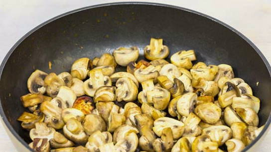 - Snijd de champignons in partjes en bak ze in een droge koekenpan tot al het vocht is verdampt.
