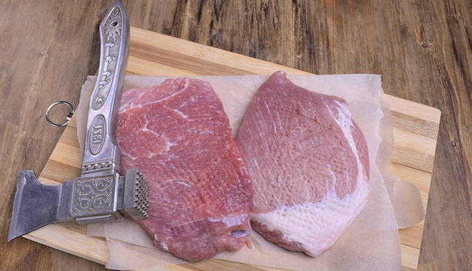 - Snijd het varkensvlees in plakken van 1 centimeter dik en klop ze aan beide kanten los.