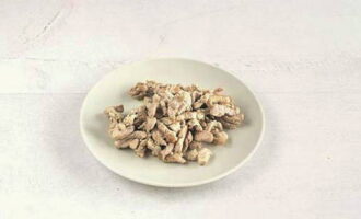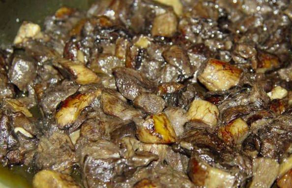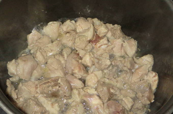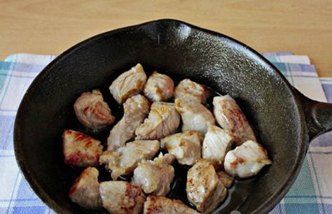 - Snijd het vlees vervolgens in kleinere stukjes en bak ze goudbruin in plantaardige olie. Kruid met zout en breng op smaak.