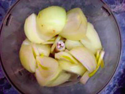 - Schil de ui, snijd in vier delen en hak vervolgens in een blender.