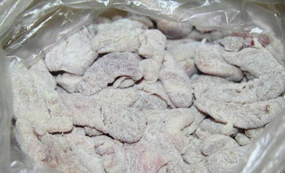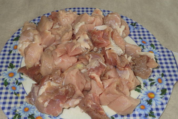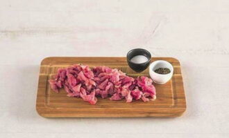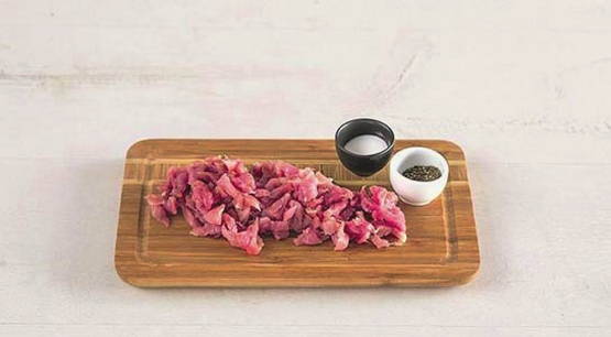 - Snijd het vlees in kleine stukjes, meng het met zout en bloem.