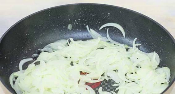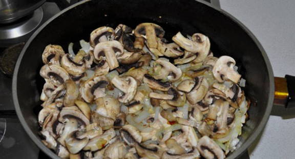 - Snijd uien in halve ringen, champignons in plakjes. Fruit eerst de uien in een koekenpan tot ze transparant zijn.