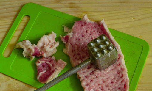 - Snijd het varkensvlees in plakjes, klop aan beide kanten.