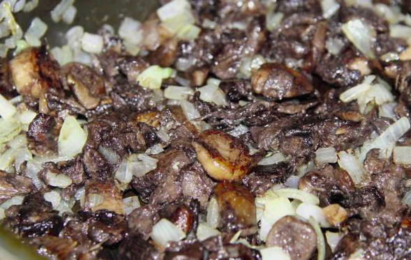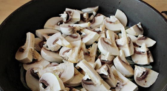 - Voeg vervolgens plakjes champignons toe aan de ui en blijf bakken tot het vocht is verdampt.