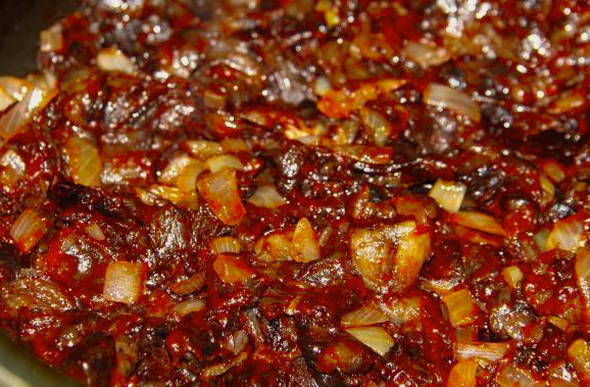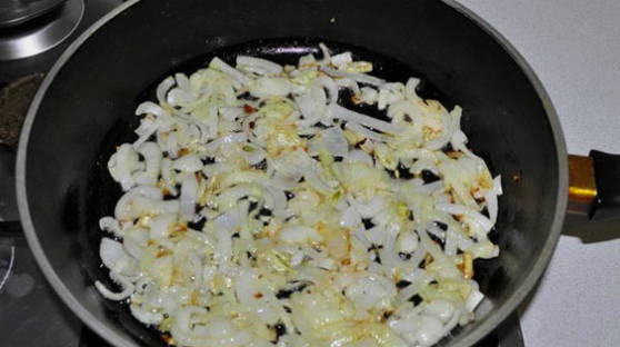 - Fruit in een aparte koekenpan de uien tot ze transparant zijn.
