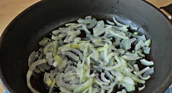 - Fruit in een andere koekenpan de ui, in halve ringen gesneden.