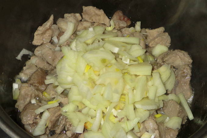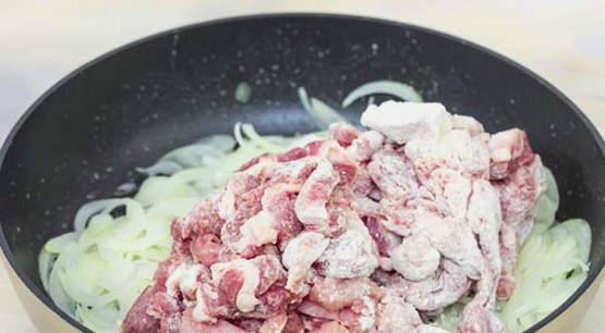 - Snijd het varkensvlees in blokjes, doe het in een kom, voeg bloem toe en roer zodat elk stuk bedekt is met bloem. Voeg vervolgens het vlees aan de pan toe aan de ui, roer en bak goudbruin.