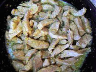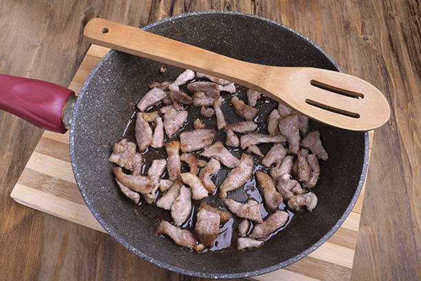 - Bak het vlees in plantaardige olie goudbruin.