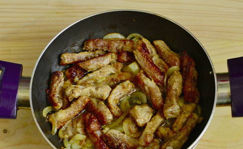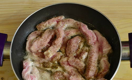 - Bak het vlees in een voorverwarmde koekenpan snel goudbruin.
