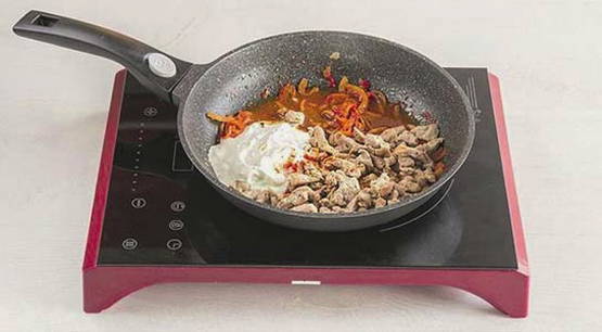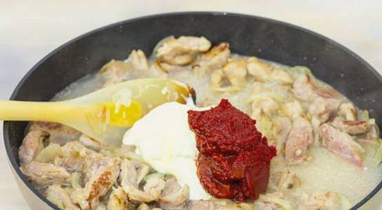 - Voeg vervolgens zure room en tomatenpuree toe, roer, zet het vuur lager en laat 40 minuten sudderen.
