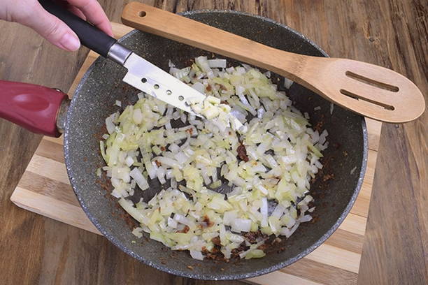 - Voeg vervolgens de ui toe aan het vlees, roer en bak 5-7 minuten.