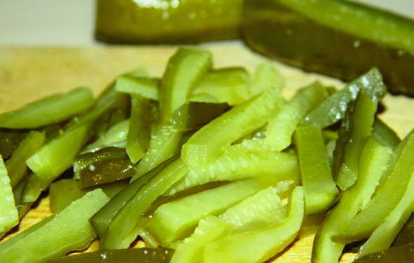 - Snijd de ingelegde komkommers in reepjes.