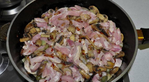- Voeg vervolgens champignons, zout en peper toe, roer, verwarm een paar minuten en je kunt het gerecht serveren.