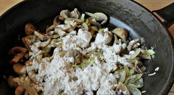 - Voeg vervolgens bloem toe en roer snel de inhoud van de pan.