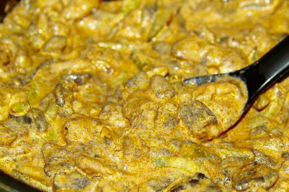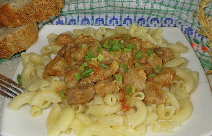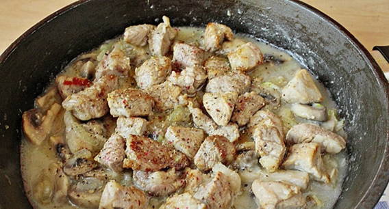 Beef stroganoff lijkt qua uiterlijk op goulash. Varkensvlees moet in kleine stukjes worden gesneden, zodat ze tijd hebben om te stoven. Dit gerecht kan niet alleen in een pan worden gekookt, maar ook in een slowcooker.