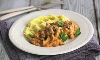 - Sudder de stroganoff met gesloten deksel op matig vuur gedurende 15-20 minuten. Serveer het afgewerkte gerecht warm met een bijgerecht naar keuze.