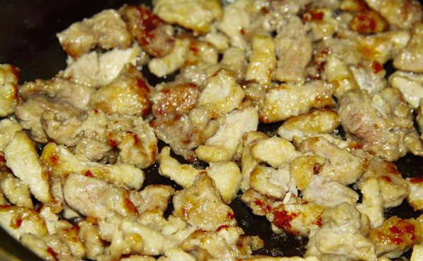 - Giet plantaardige olie in een voorverwarmde pan, bak het varkensvlees op middelhoog vuur goudbruin. Voeg vervolgens ui, zout, peper en paprika toe, blijf bakken tot ze zacht zijn.