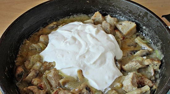 - Voeg champignons, uien, komkommers en zure room toe aan het vlees.