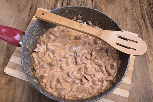 - Verwarm de room in een aparte kom tot bijna aan de kook en giet deze in de braadpan. Voeg zout en kruiden naar smaak toe, roer en laat de beef stroganoff afgedekt op matig vuur 25-30 minuten sudderen.