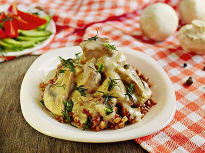 - Beef stroganoff met varkensvlees en champignons in zure roomsaus