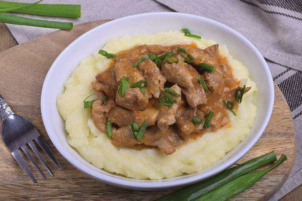 - Aardappelpuree is perfect voor beef stroganoff. Bestrooi het gerecht met gehakte kruiden en serveer.