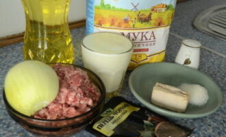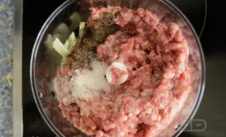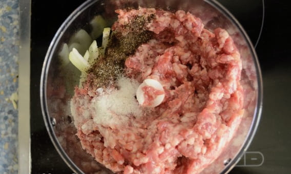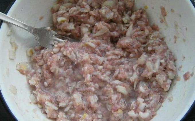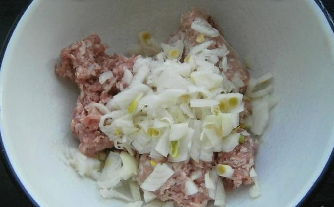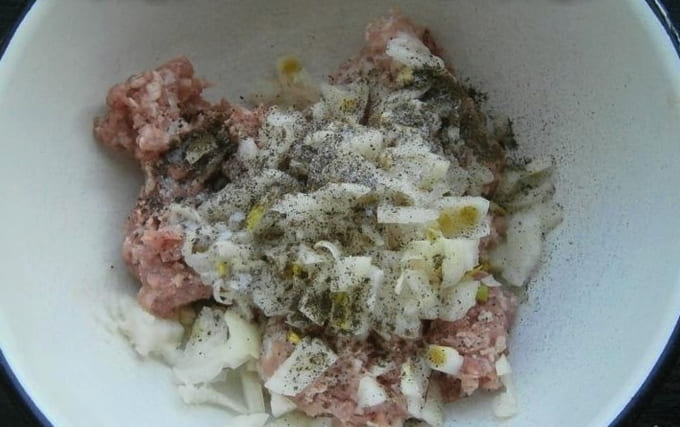 - We bereiden de vulling apart. Meng het gehakt met de gesnipperde ui, zout en gemalen peper. We beginnen en vormen de blanken.